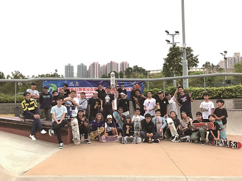 香 港 滑 板 公 開 賽 2019 一 眾 參 賽 者 和 評 判 留 影 。黎 家 威 攝