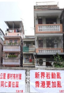 去 年 , 發 展 局 局 長 林 鄭 月 娥 表 示 要 強 硬 執 法 處 理 新 界 村 屋 僭 建 物 , 包 括 天 台 玻 璃 屋 、 圍 封 式 天 台 、 露 台 和 簷 篷 和 超 建 樓 層 等 , 原 居 民 強 烈 不 滿 。 有 近 千 名 原 居 民 包 圍 立 法 會 抗 議 , 更 有 村 民 把 林 鄭 月 娥 的 紙 紮 娃 娃 放 入 紙 棺 材 焚 燒 , 以 示 不 滿 。