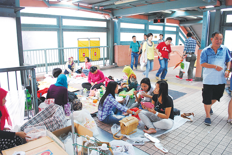 一 名 婆 婆 投 訴 : 「 外 傭 在 橋 上 聚 集 , 阻 塞 行 人 通 道 , 我 剛 才 在 升 降 機 門 前 就 被 他 們 絆 倒 ﹗ 」